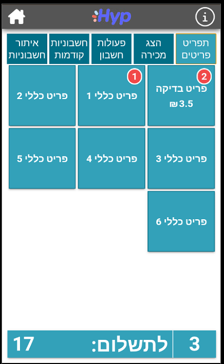 1. במסך הבית, לוחצים על כפתור "קופה" ולאחר מכן על "תפריט פריטים".