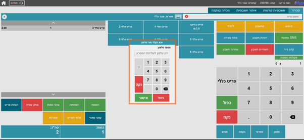 1. במהלך ביצוע ההזמנה (לפני שלב התשלום), מזינים את מספר הטלפון של הלקוח באמצעות לחיצה על כפתור "SMS הזמנה" בצד ימין של המסך.