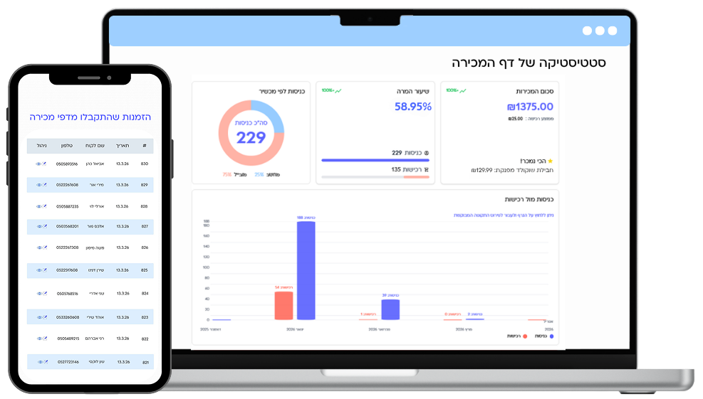 דשבורד נתונים ברור ונוח, שמאפשר לקבל תמונת מצב מלאה בזמן אמת, לעקוב אחרי פעילות הדף והרכישות, להכיר דפוסי שימוש של לקוחות ולשפר את ביצועי המכירה.
