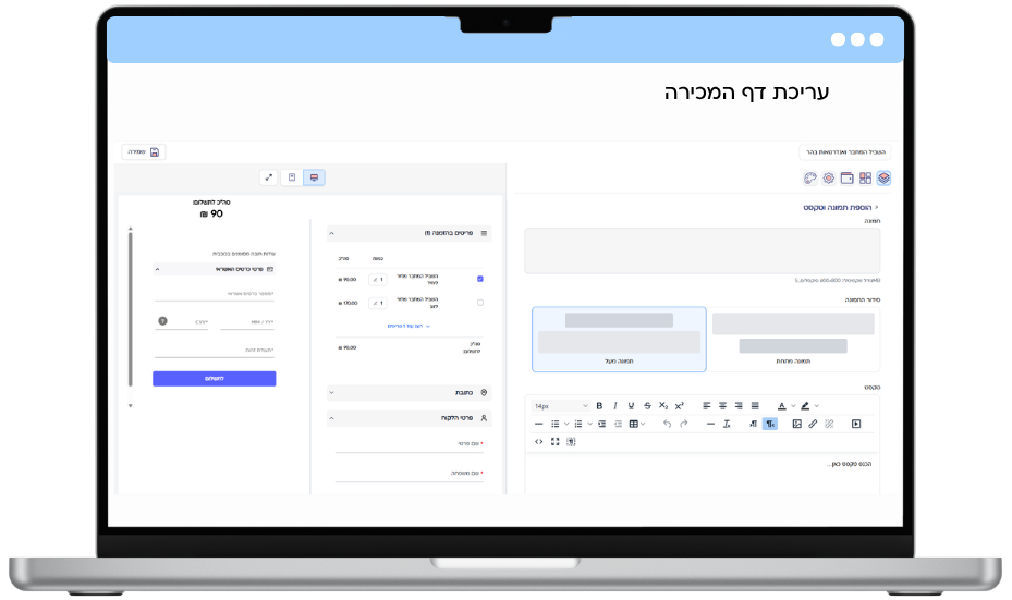 מקימים דף מכירה בעיצוב מותאם לעסק באמצעות ממשק אינטואיטיבי ונוח לשימוש - ניתן להוסיף תוכן, לוגו, תמונות ואת פרטי המוצרים, ולבחור איך דף המכירה יוצג ואיך תתבצע המכירה.